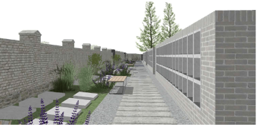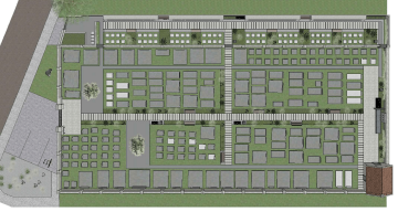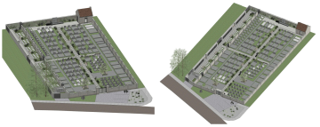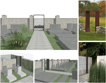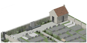 Hlavním prvkem návrhu je rozšíření hřbitova – pořídili jsme pruh pozemku, který o pětinu rozšíří prostor hřbitova. V nové části hřbitova jsou proto rozmístěny jen sekvence hrobů určených pro uložení urny. Urnové hroby jsou pravidelně členěny poli s nízkou dekorativní zelení tak, aby dlouhý úzký koridor nepůsobil nepříjemně a stísněně.