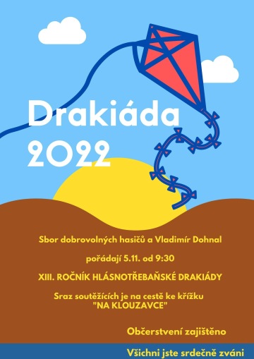 Sbor dobrovolných hasičů a Vladimír Dohnal pořádají 5. 11. 2022 od 9:30 hodin XIII. ročník hlásnotřebaňské drakiády.