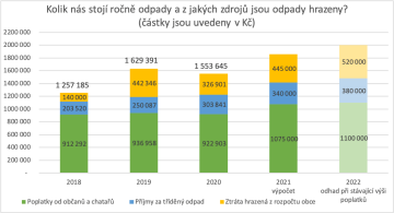 V příštím roce odhadujeme, že celkové náklady na odpady přesáhnou 2 miliony Kč. Ztráta hrazená z obecního rozpočtu by překročila 500 tisíc Kč. Zastupitelé se shodli, že budou hledat úspory v nákladech, ale pravděpodobně bude nutné zvýšit na rok 2022 výši poplatků, které jsou v naší obci jedny z nejnižších v regionu.