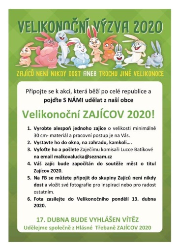 Letošní Velikonoce budou asi trochu netradiční, Hasiči Hlásná Třebaň se společně s obcí Hlásná Třebaň a Domečkem Hořovice rozhodli zapojit naší obec do soutěže o Zajícov 2020. Podťe do toho s námi.